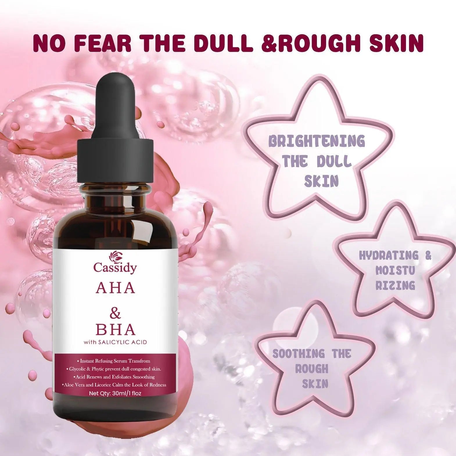 Upgrade your skincare game with CASSIDY AHA & BHA Serum, powered by Salicylic Acid, Alpha Hydroxy Acids (AHAs), and Beta Hydroxy Acids (BHAs) for complete skin renewal. This exfoliating serum penetrates deep into the pores to clear out oil, dirt, and dead skin, reducing acne and preventing breakouts.